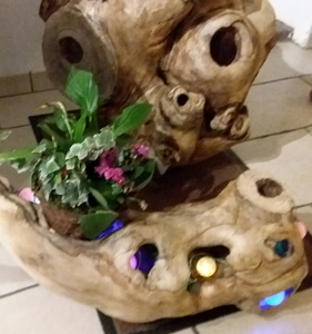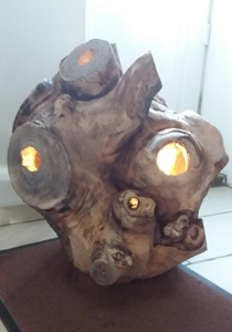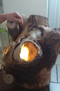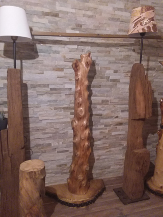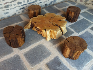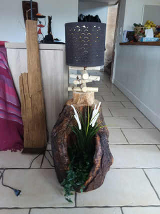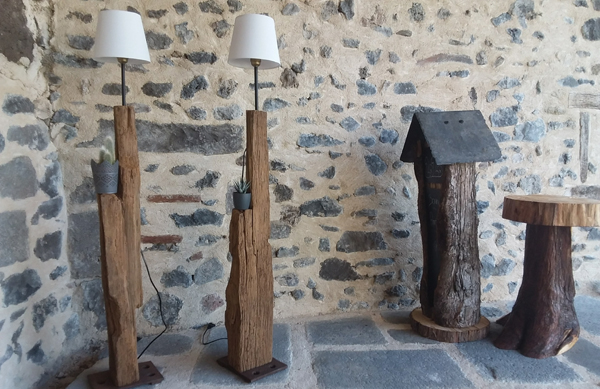 les branches et troncs coupés lors de mes réalisations de chantiers sont réemployés, associés à d'autres matériaux de récupération pour créer divers objets en bois.